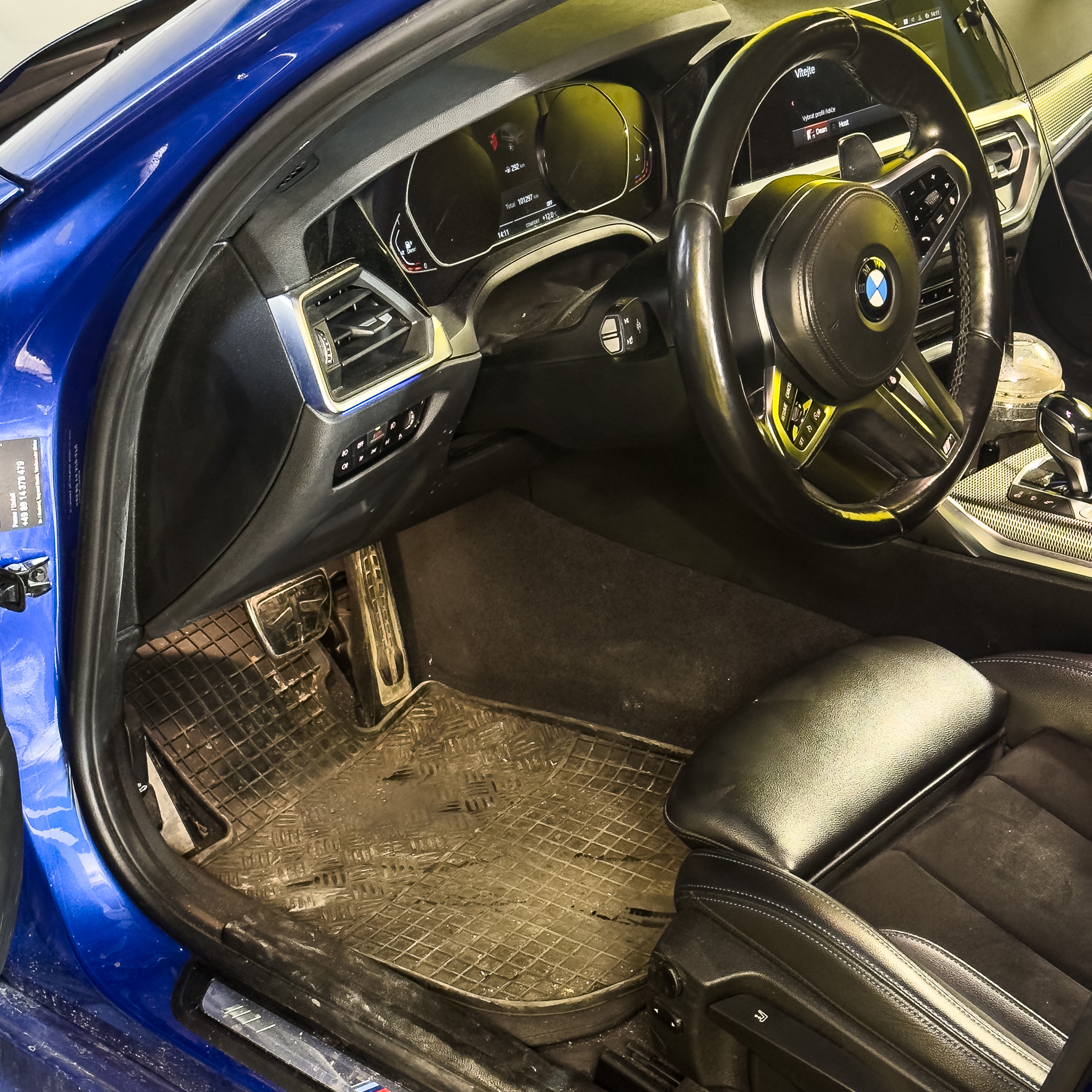 Interiér: Kompletní vysátí interiéru a tepování koberečků; Hloubkové čištění a tepování sedaček; Čištění plastových částí a palubní desky; Kompletní ošetření všech plastových a kožených částí; Mytí a leštění oken zevnitř; Čištění všech ovládacích prvků, pedálů a výdechů klimatizace; Osvěžení interiéru pomocí speciální vůně; Závěrečná kontrola kvality